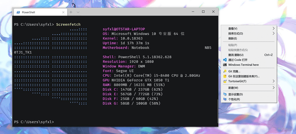 光有 WT 肯定是不够的,使用一下你会发现,也就主题的颜色变了,外表变了,字体好看了,终端很多字符都还是白色,并没有像 oh-my-zsh 那么色彩斑斓。本节就来改造下 PowerShell(以下简称 Posh)。