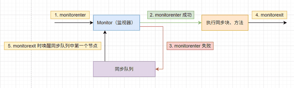 进入和退出 Monitor 通过 monitorenter 和 monitorexit 指令实现。不过标注在方法上的是通过访问标志(flags)实现的,JVM 在进入存在 ACC_SYNCHRONIZED 访问标志的方法时会同进入 monitorenter 一样操作,退出时同理。